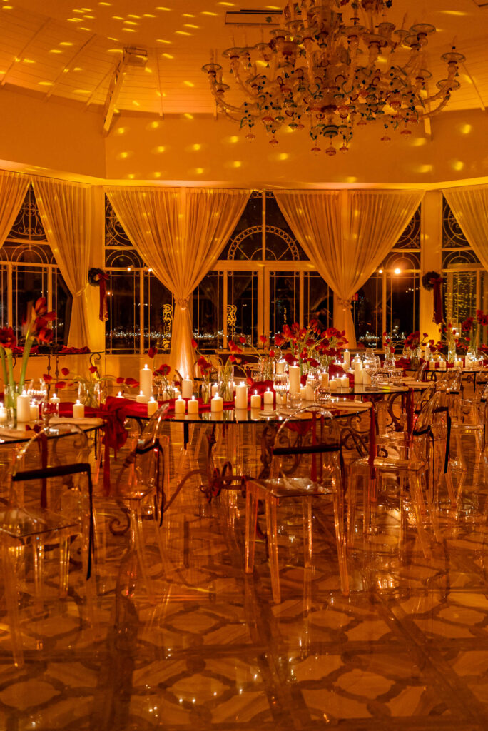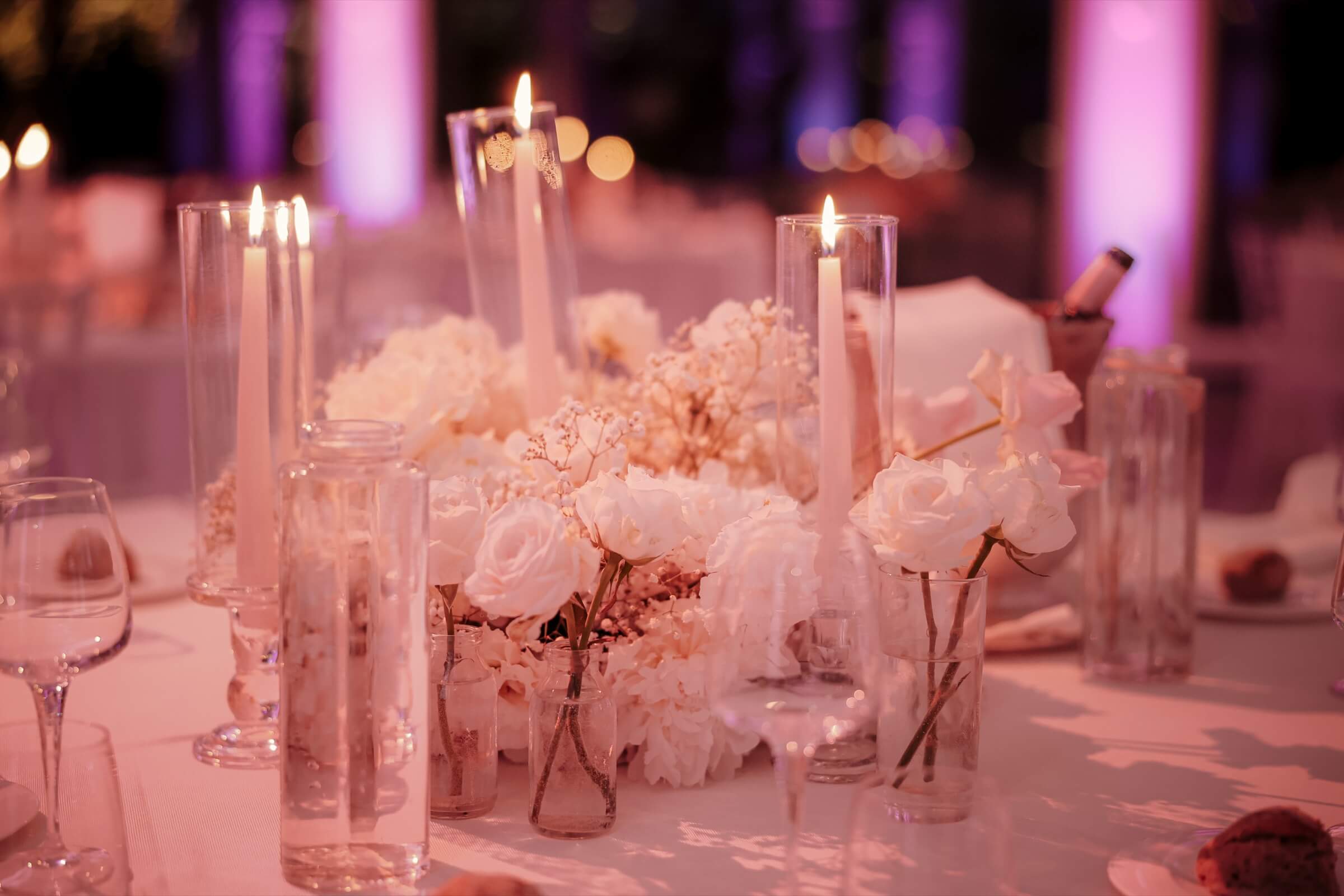 Candele, punti luce caldi, riflessi sulle superfici trasparenti costruiscono un’atmosfera raccolta, quasi sospesa. La luce non deve essere protagonista, ma presenza costante, capace di valorizzare i volumi e accarezzare i dettagli.